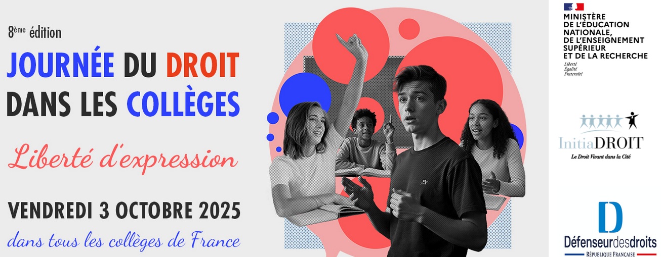 Nous vous communiquons un courrier envoyé aux chefs d'établissement à propos de la journée du droit à l'école, qui se déroule ce vendredi 3 octobre. Le thème annuel est la liberté d'expression. Il est encore temps pour les collèges de s'inscrire sur la plateforme dédiée (https://journeedudroit.fr/)