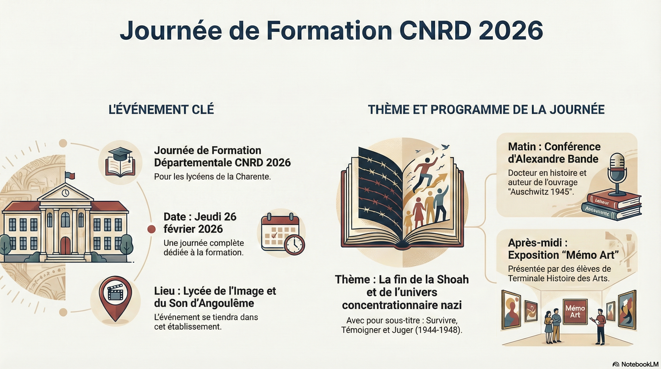 En partenariat avec l'APHG Poitou-Charentes, le jeudi 26 février 2026, une journée de formation départementale pour le CNRD est organisée au Lycée de l'Image et du Son d'Angoulême. Il s'agit pour l'occasion de convoquer tant l'histoire que l'histoire des arts pour former les lycéens de la Charente à la thèmatique de 2026: la fin de la Shoah et de l'univers concentrationnaire nazi. Survivre, témoigner et juger (1944-1948). De même, ce temps s'inscrit également dans le thème 3 du programme de Terminale HGGSP, Histoire et mémoires. A cette fin, Alexandre Bande, docteur en histoire et auteur de l'ouvrage Auschwitz 1945 animera une conférence le matin. Puis l'après-midi, des élèves de Terminale HDA du lycée Marguerite de Valois présenteront leur formidable exposition : Mémo Art. Vous pourrez d'ailleurs retrouver leur projet sur le site HDA de Poitiers. La finalité de cette initiative s'inscrit tant dans le parcours citoyen que dans celui du parcours d'éducation artistique et culturelle (PEAC) de l'élève.
