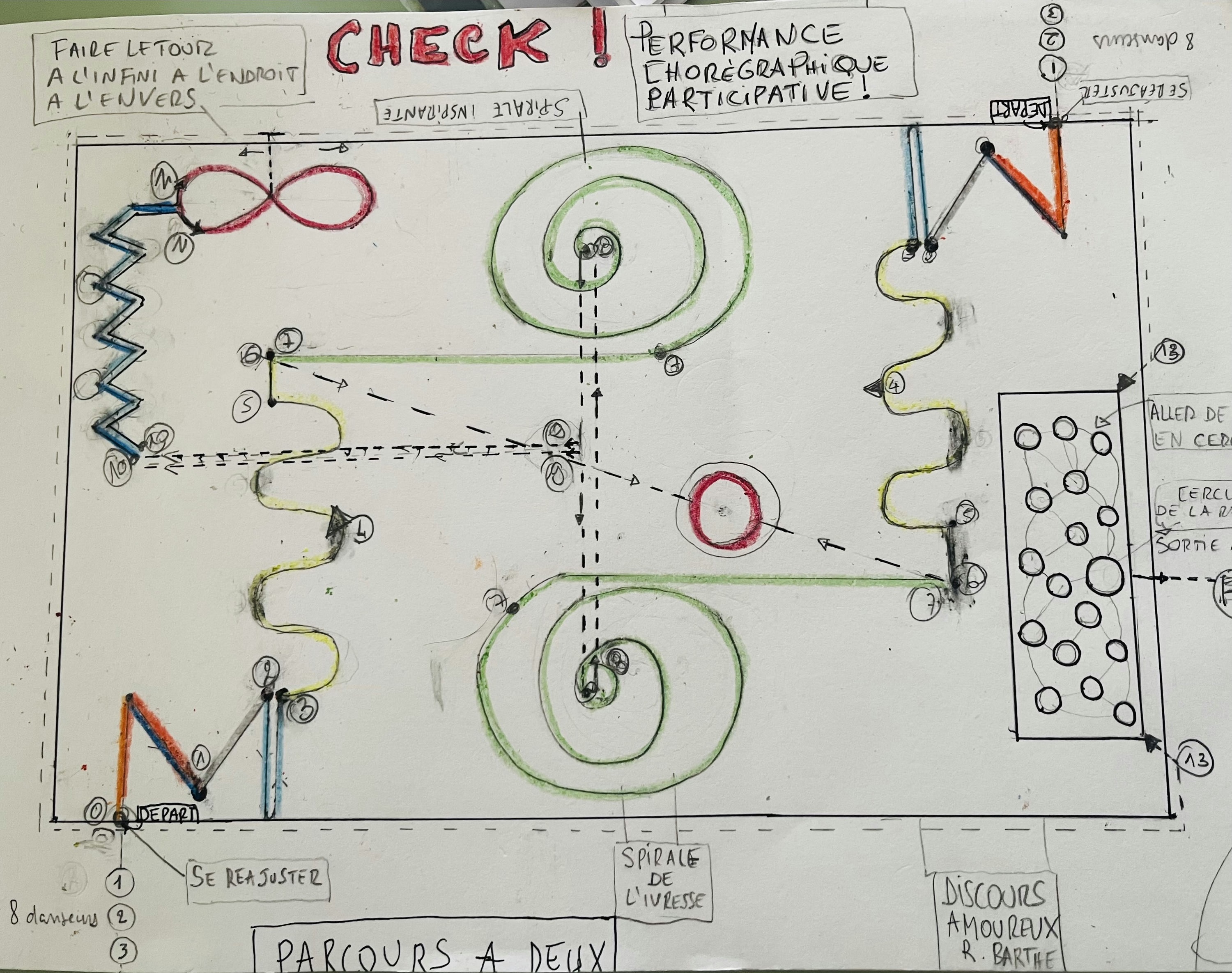 Le but est d'aller à la rencontre de l'autre avec tout ce que cela comporte de surprises, de joie mais pas seulement... D'y aller avec le corps et la Danse. Le parcours sera peint au sol. Si Check est accueilli dans un établissement scolaire, il restera jusqu'à ce que la pluie, les passages, les intempéries l'effacent. Mais d'ici là les élèves auront eu le temps de l'expérimenter et de l'utiliser à leur guise.